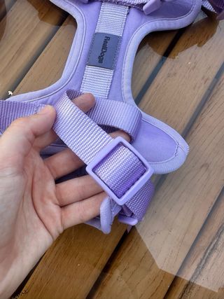 Preciosa correa y arnés para perro de la marca RealDogs, color lila. El juego incluye un práctico dispensador de bolsas para excrementos. - Material suave y agradable al tacto. - Diseño ligero y cómodo para tu mascota. - Hebillas resistentes y duraderas una de ellas es anti tirones y la tiene en la zona del pecho - Correa de longitud ideal para paseos. además, el material es apto para el agua y se seca muy rápido es neopreno . en la página web se vende el kit por 72 € . A veces hay un 25 % de descuento y se queda en 58 € Yo lo dejo en 45