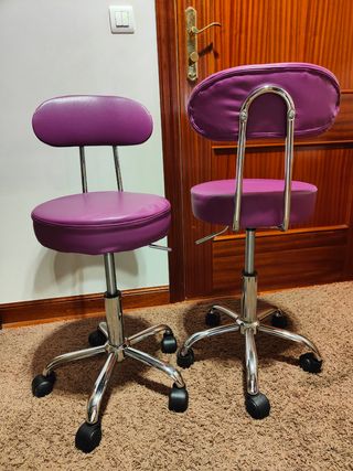 Conjunto de dos sillas de escritorio con un diseño moderno y funcional. Perfecto para niñas pero también son de adulto. - Asiento y respaldo tapizados en polipiel morada. - Base de metal cromado con cinco ruedas. - Altura regulable mediante pistón de gas. Funcionan perfectamente pero tienen pelado el respaldo, adjunto fotos. Precio de las 2 hoy (me urge quitar) 10€ , recoger en Balmaseda