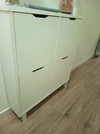 Mueble zapatero de Ikea en color blanco. - Diseño moderno y funcional. - Dos compartimentos abatibles para guardar zapatos. En buenas condiciones. Recoger en calle Juan Bravo