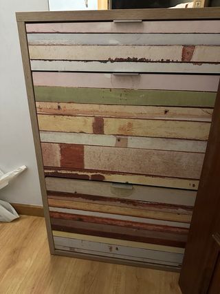 Mueble zapatero con espejo integrado y varios cajones frontales con un diseño de listones de madera en diferentes colores. - Diseño de listones multicolor en los frentes de los cajones. - Estructura de madera. - Espejo Tamaño: 90 Se puede vender por separado zapatero y espejo