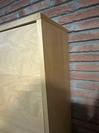 Mueble zapatero de madera con un diseño sencillo y funcional. - Dos puertas frontales. - Tiradores redondos. - Seis baldas regulables. Se entrega montado. Recoger en Castro Urdiales. Edificio con ascensor. Tiene un golpe en esquina superior (ver foto). Caben unos 21 pares de zapatillas deportivas grandes. Si el calzado es más pequeño (sandalias, zapatos infantil), cabrían más. Medidas: 75,3 ancho, 101 alto, 36 fondo. Balda pared con aportes metálicos. Mide 80 de largo, 21 de fondo y 2,2 de grosor.