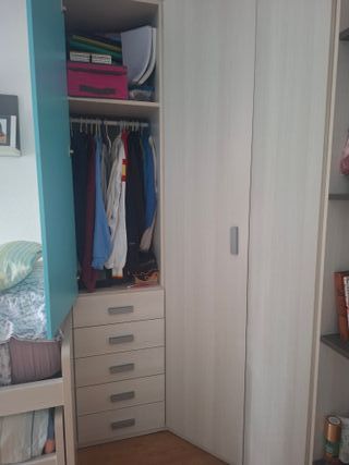 Se vende dormitorio juvenil en perfecto estado, con muy poco uso. - Cama con cajones de gran capacidad, 2 extra grandes y 4 más estrechos. - Armario esquinero de gran capacidad, módulo de armario con cajones, estanterías y zapatero ( Las postales del armario solo están pegadas con celo) DESMONTAJE Y TRANSPORTE A CARGO DEL COMPRADOR