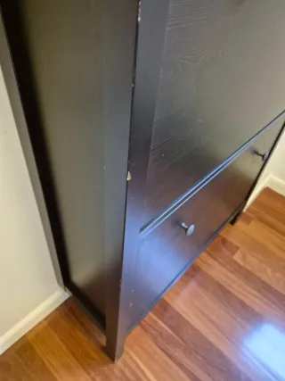 Zapatero modelo Hemnes de Ikea. Un mueble práctico y elegante para organizar tus zapatos. El único desperfecto es el que se muestra en la foto de las patas (se puede pintar). Los tiradores que traen son los originarios de Ikea (color metal) o si lo prefiere se puede entregar con los de madera. - Diseño de cuatro compartimentos. - Tiradores redondos de madera.