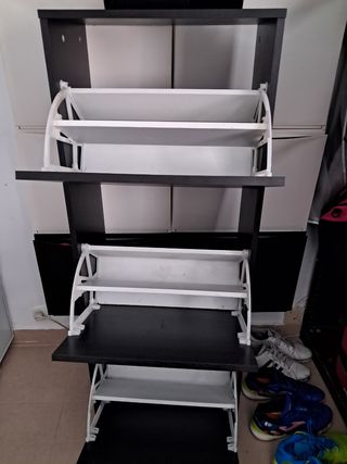 Zapatero de cuatro niveles en color negro y plateado. Es de metal y plástico, y se encuentra nuevo en su caja. - Medidas: 42x20x68cm - Estructura resistente - Ideal para organizar el calzado,bolsos o cualquier cosa que quieras