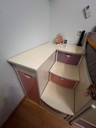 Mueble multifuncional que combina zapatero, escalera y cajonera. - Cajones de color rosa y morado. - Acabado en blanco y madera. - Zapatero con ruedas 75€ cada uno, se pueden separar