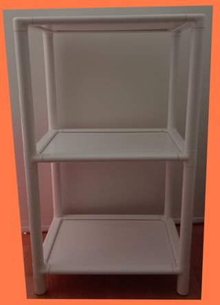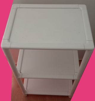 Estantería o zapatero, para terrazas o interior. Se mueve un poco porque las patas están hundidas como se puede ver. Se arregla con cualquier taco de goma por ejemplo, que los venden muy baratos. Es una mezcla de plástico y melamina creo, pero no puedo asegurarlo. Y está algo desgastada en las esquinas de la parte de abajo de las láminas