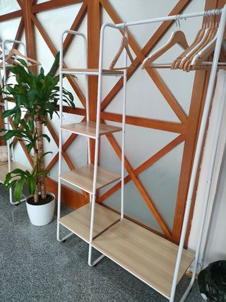 Percheros de metal en color blanco y madera. Con zapatero, estantería de 5 alturas y barra para colgar las perchas. En perfectas condiciones.