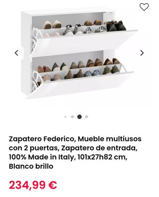 Tiene un pequeño desperfecto. En amazon cuesta 89'90€. Con tres puertas abatibles con doble profundidad. La estructura está hecha de melamina, material muy resistente, duradero y fácil de limpiar. 60 x 24 x 120 cm, se puede colocar prácticamente en cualquier lugar, como detrás de puertas y armarios ocupando el mínimo espacio.