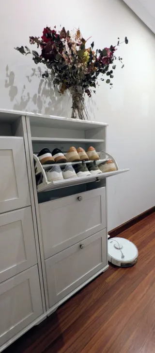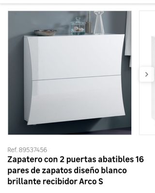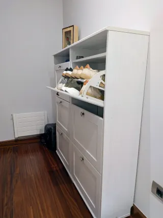 Mueble zapatero en buen estado. Su diseño moderno y color blanco lo hacen ideal para cualquier entrada. Tiene varios estantes que se adaptan en altura y un cajón interior. No es de Ikea, lo compré en el Corte Inglés. Esta vivido pero bien conservado. - Dos puertas con tiradores. - Base con diseño. - Acabado liso. Vivo en Bilbao y prefiero entrega en persona.