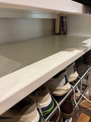 Zapatero Ikea blanco. Modelo brusali. Tiene tres desperfectos, uno de ellos en la zona interna en la madera que está para clavarlo contra la pared no se ve absolutamente nada yo lo tengo pegado con una cinta americana pero se puede hacer un arreglo mejor . Los otros dos desperfectos si están a la vista, uno de ellos en el panel superior donde apoyamos las cosas yo suelo tener un Marco de fotos y no se ve absolutamente nada. El otro desperfecto se encuentra en un lateral en la parte inferior a la altura del suelo..