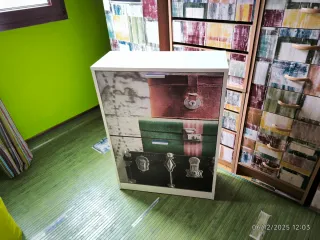 Mueble zapatero con un diseño único que simula maletas antiguas. - Diseño frontal con imágenes de maletas. - Estructura de madera