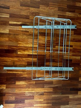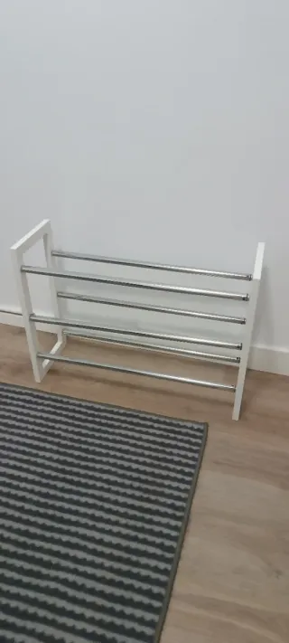 Zapatero extensible con estructura de madera y barras metálicas. Se montó para su uso pero no se ha usado apenas. Se entrega desmontado y en su caja con instrucciones.