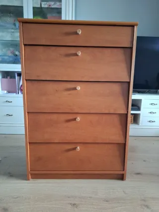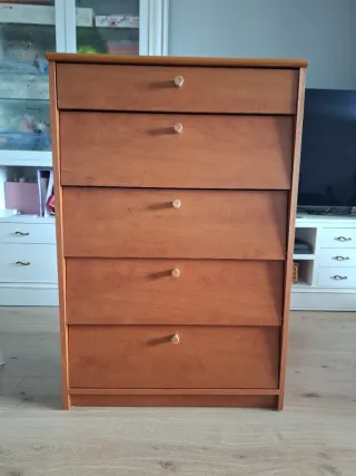 Cómoda de madera con cinco cajones. Un mueble práctico y elegante para tu hogar. - Cinco cajones amplios. - Tiradores redondos. - Ideal para guardar zapatos