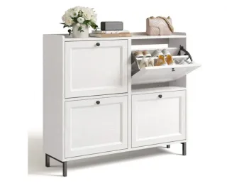 Mueble zapatero de diseño moderno con acabado en blanco. - Estructura principal de madera. - Patas de metal. - Compartimentos abatibles para zapatos.
