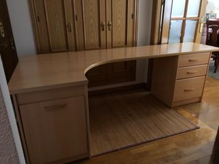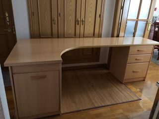 Mesa de estudio con 3 cajones, el último de mayor tamaño y un amplio zapatero en el otro extremo. Ambos módulos se pueden intercambiar de posición. La mesa es en L, la parte ancha del fondo mide 103 cm y el resto de mesa 54 cm, de largo mide 240 cm y de alto 70 cm.