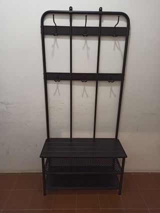 Mueble de entrada multifuncional que combina perchero, zapatero y banco. - Diseño elegante con estructura de madera blanca - Espacio superior para colgar abrigos y sombreros. - Banco con compartimentos para organizar calzado. Está nuevo sin estrenar, se encuentra en la caja original. Su precio actual es 129,99€ Recoger en persona