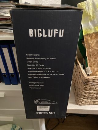 Vendo este zapatero de plástico blanco de la marca BIGLUFU. Es perfecto para organizar el calzado. - Capacidad para 20 pares de zapatos. - Incluye manual de usuario.