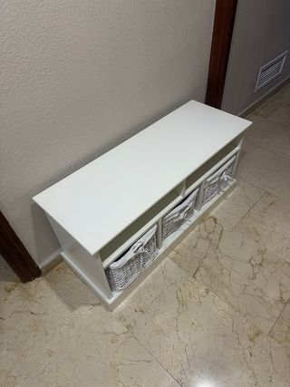 Banco zapatero de estilo moderno, perfecto para organizar tu calzado y tenerlo a mano. - Tres cestas de mimbre incluidas. - Diseño de líneas limpias y acabado blanco.