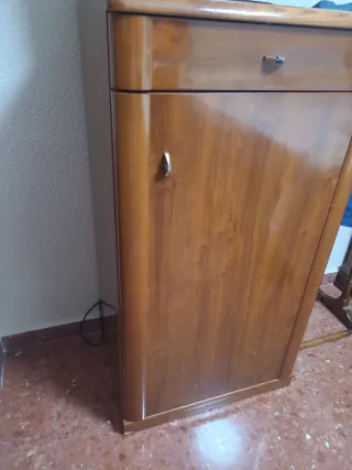 Escritorio con 4 cajones y departamento de zapatero.Que mide 195 cm de largo pero puedo acortarlo y quedar en 176 cm para que se quede recto.Alto 76 cm y fondo 54. Mesita de noche compañera incluida.El escritorio para transportarlo son tres partes, zapatero,cajonera y el tablero.Preguntar precio con transporte incluido.El precio del anuncio es recogiéndolo en la puerta de la calle.