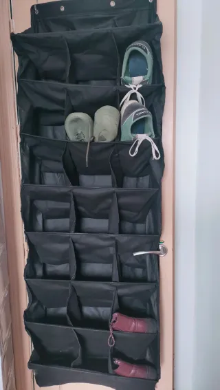 Organizador colgante para zapatos, ideal para mantener el orden en casa. -Caben dos zapatos por hueco - Fabricado en poliéster resistente. - Diseño con múltiples compartimentos.