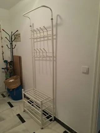 Práctico perchero con un diseño moderno y funcional, ideal para organizar tu entrada. - Dos niveles de ganchos para abrigos y chaquetas. - Estructura de metal resistente. - Incluye un zapatero de dos baldas en la parte inferior.
