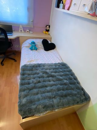Conjunto de muebles para habitación juvenil que incluye cama con arcón, escritorio (sin silla), colchón, y repisas. - Cama con espacio de almacenamiento integrado (100x200) de gran capacidad (arcón): 100€ - Colchón 90x 190: 25€ - Escritorio funcional con zapatero debajo (195x 43 y 60, altura 80): 60€ - 2 repisas fuertes y de gran capacidad (160x24x3 + 200x24x3): 25€ En un magnifico estado. Se vende todo junto (150€) o por separado: - Cama Muy bonito!! ❤️