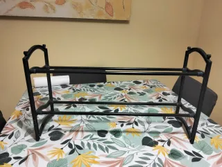 Estupendo zapatero de metal de 5 niveles y color negro, ¡como nuevo! Tiene 8 ganchos para colgar abrigos, bolsos u otros objetos. - Medidas: 60cm (Largo) x 25cm (Ancho) x 169cm (Alto) - Pintura horneada, resistente al agua y al óxido. - Estructura de acero resistente y con gran capacidad de carga.