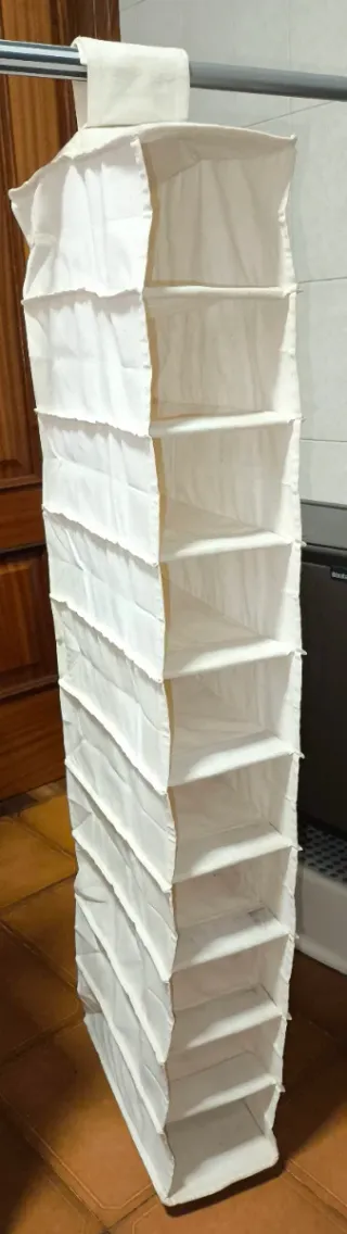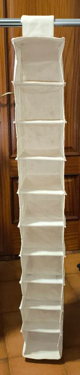Organizador colgante de tela con diez compartimentos de 15x30x10 cm cada uno aprox. - Ideal para maximizar el espacio de almacenamiento. - Se cuelga fácilmente de la barra del colgador del armario mediante un cierre robusto de belcro - Diseño práctico y funcional.