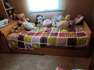 Dormitorio juvenil de madera.Con cama nido, frontal de muebles con altillos y zapatero y colchones.El panel trasero está deteriorado un poco, aunque se puede quitar.color miel.
