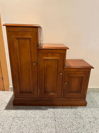 Mueble zapatero de madera con un diseño clásico y elegante. Se encuentra en buenas condiciones, listo para darle un nuevo hogar. - Acabado en madera natural. - Tres compartimentos amplios para organizar calzado. - Tiradores metálicos en cada puerta.