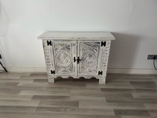 Mueble auxiliar con un diseño único y detalles tallados. - Acabado envejecido en blanco y negro. - Puertas con herrajes decorativos. - Patas con forma. - Diseño con motivos florales y de aves.