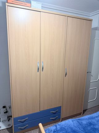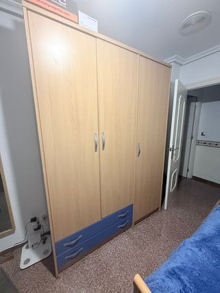 Los muebles son de madera y están en muy buen estado, tal y como se montaron por primera vez. Viene incluido: Dos camas (una de ellas extraíble) con 4 amplios cajones inferiores. (85cm de alto, 215 de largo y 100 de ancho). El armario es de 3 puertas (la grande de la derecha contiene 5 grandes compartimentos, las dos de la izquierda un compartimento grande más otro mediano arriba). Además de los dos cajones inferiores. (220cm de alto, 160cm de largo y 55cm de ancho). Escritorio (el cual lleva incluido un zapatero corredero extraíble con ruedas, con espacio para 6 pares de zapatos). (185cm de largo, 75cm de alto, y 55cm de ancho).