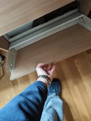 Mesa escritorio con cajones en lado derecho y zapatero en el lado izquierdo