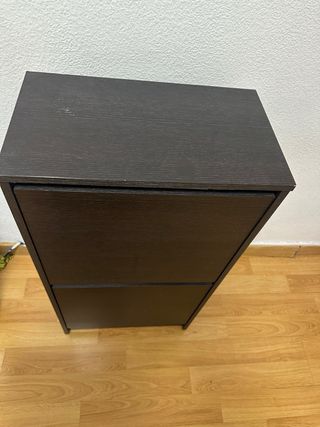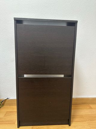 Zapatero marrón oscuro de Ikea. - Dos compartimentos amplios. Un pequeño defecto en la parte superior. Se muestra en la foto. - Foto con medidas.