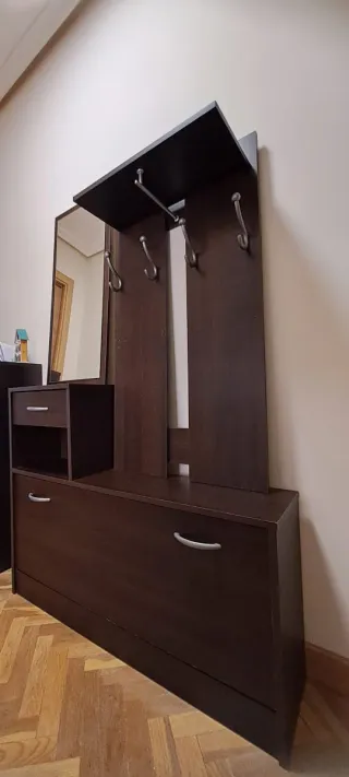 Mueble recibidor con zapatero y cajón. - Acabado en color marrón oscuro. Medidas: Zapatero: Alto 80cm, Ancho 98cm, Fondo 24,5cm Perchero: Alto 101cm, Ancho 54cm, Fondo 25cm Espejo: Alto 82cm, Ancho 36cm Tiene algún desperfecto del uso. Está indicado en las fotos.