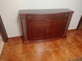 Taquillón de caoba perfecto como aparador en el salon para los platos o en la entrada como zapatero, con mucho espacio de almacenaje y una amplia superficie. Es de losaños 80 pero está.muy bien conservado, solo argunas marcas en la base como las de la foto y algun tirador suelto. Perfecto para restaurar pintándolo en algun color claro como beige, verde silva, etc.
