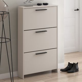 Mueble zapatero con tres puertas abatibles. Su diseño moderno y color neutro lo hacen fácil de integrar en cualquier espacio. - Tres compartimentos para organizar calzado. - Tiradores negros para un contraste elegante.