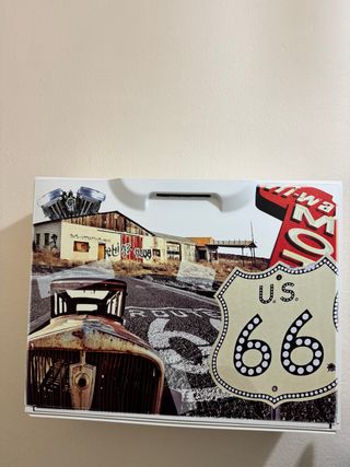 Zapatero con un diseño único inspirado en la Ruta 66. - Ilustración de carretera, coche clásico y moto. - Detalle de señal U.S. 66.