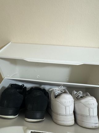 Zapatero de diseño moderno con tres compartimentos para organizar tus zapatos. - Color blanco y beige. - Fabricado en plástico y madera. - Medidas: 79x29x148cm. - Tiene algunas marcas que muestro en detalle en las fotos. 100% funcional - Solo recogida en Girona (Montilivi) tags: zapatero shoe rack ställ stall brusali hauga hemnes nordli pax aheim idanas smastad platsa trones bissa murvel mackapar smagora zapatos armario storage shoe organizer recibidor entryway estanteria colgador sneakers