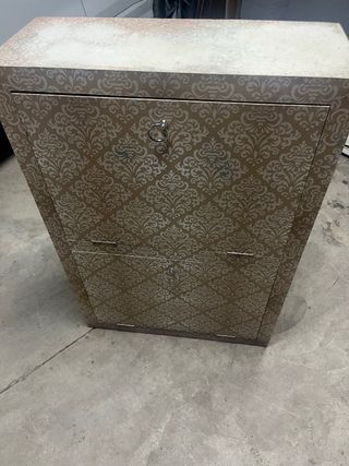 Mueble zapatero con un diseño vintage y elegante. Su acabado combina tonos beige y dorado, aportando un toque sofisticado a cualquier espacio. - Patrón damasco decorativo. - Tiradores metálicos. - Estructura de madera y metal.