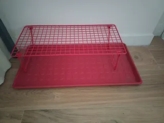 Zapatero de la marca IKEA con un diseño moderno y funcional. - Estructura de metal. - Bandeja de plástico. - Color rojo vibrante.