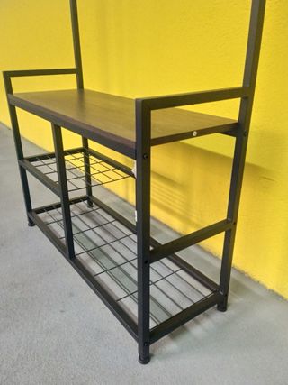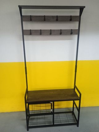 Mueble funcional para organizar tu entrada. - Dos niveles de estantes para zapatos. - Barra superior con ganchos para abrigos y bolsos. - Estructura robusta de metal. - Acabado en madera. Se desmonta para transportar Se puede recoger Madrid, zona de San blas o leganes Mide 1’82 alto x 84 ancho x 30 fondo A ESTRENAR .