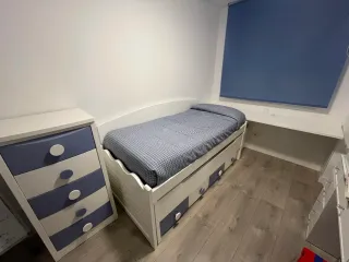 Conjunto de habitación juvenil con compacto cama doble y singonier a juego. - Compacto con cama doble y con cajones - Sinfonier de cinco cajones. - Diseño moderno en blanco y azul. - Mesa con zapatero Cama principal de 90 X 190 y secundaria de 90 X 180 Producto a desmontar y recoger por el comprador.