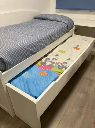 Habitación juvenil completa La cama es de color naranja y madera clara. Incluye cama nido y los dos colchones de 90x190. El de arriba es de viscolastica, el de abajo no es de viscolastica pero de buena calidad y con poco uso. Está en buen estado. - Armario con cajones. - cajonera y cabecero zapatero...