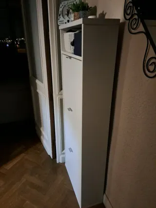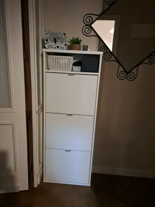 Bonito armario con puerta de espejo de Ikea. Ideal para entrada o recibidor. Con accesorios. Tengo 3 uno de ellos tiene 4 cuatro zapateros con su perchero. Otro tiene 2 cajoneras y un zapatero y otro con 3 cajoneras y los dos también tienen perchero. - Perfecto estado. - Diseño elegante y funcional. Cada uno con su puerta de espejo. Solo entrega en mano. Los tengo en Madrid. 80€ cada uno.