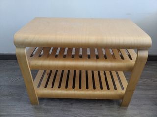 Mesilla o zapatero vintage Ikea Kantra, hoy en día difícil de encontrar, diseñada por Richard Clark al estilo del diseñador finlandés Alvar Aalto y producida por Ikea en 1999 y principios de los 2000. Hecha de madera contrachapada, tiene un diseño modular que permite colocar las estanterías interiores de forma cóncava o convexa, a gusto del usuario. Su diseño la convierte en un atractivo añadido ya sea en el recibidor, salón, baño o cualquier otro lugar de la casa. Tiene marcas de desgaste normales del uso y el tiempo, pero la madera está en perfecto estado.