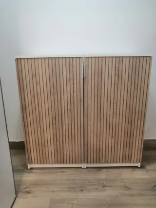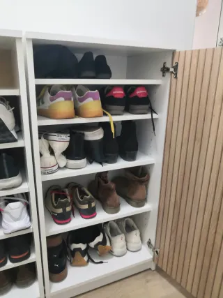 Dos muebles zapateros en melamina con 5 baldas movibles. Prácticamente nuevo. Las puertas se pueden cambiar de lado de abertura.