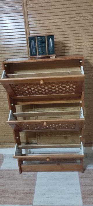 Mueble de madera parece cuatro cajones pero es puerta zapatero. Capacidad aprox de 20 pares Medidas 37 de fondo x 75 de ancho x 90 alto