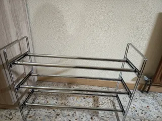 Zapatero extensible con tres niveles. Su diseño moderno y funcional lo hace ideal para organizar tus zapatos. - Estructura de metal. - Acabado plateado brillante. - Fácil de montar y desmontar.