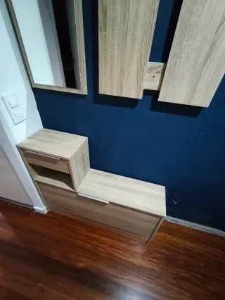 Conjunto de mueble de entrada y espejo a juego. - Mueble de madera con cajones. - Marco del espejo con detalles dorados. En perfecto estado de conservación Medidas zapatero: - 84 cm alto x 95 cm largo x 35 cm ancho. - cajón 11 cm alto - estante zapatero 28 cn cada uno (tiene 2) Medidas espejo: - 94 cm alto x 74 cm ancho. Consultad posibilidad de entrega en un radio de 50 km